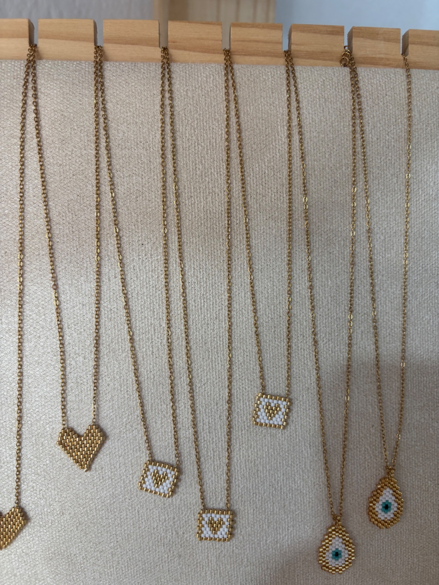 Η τετράγωνη καρδιά είναι χειροποίητη, πλεγμένη μία-μία χάντρα με προσοχή στη λεπτομέρεια, δημιουργώντας ένα minimal αλλά ιδιαίτερο αποτέλεσμα.