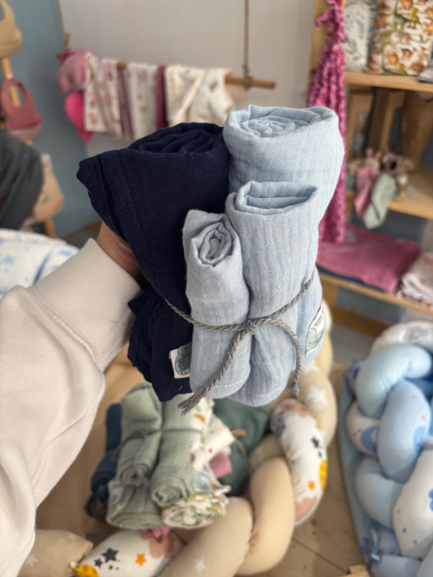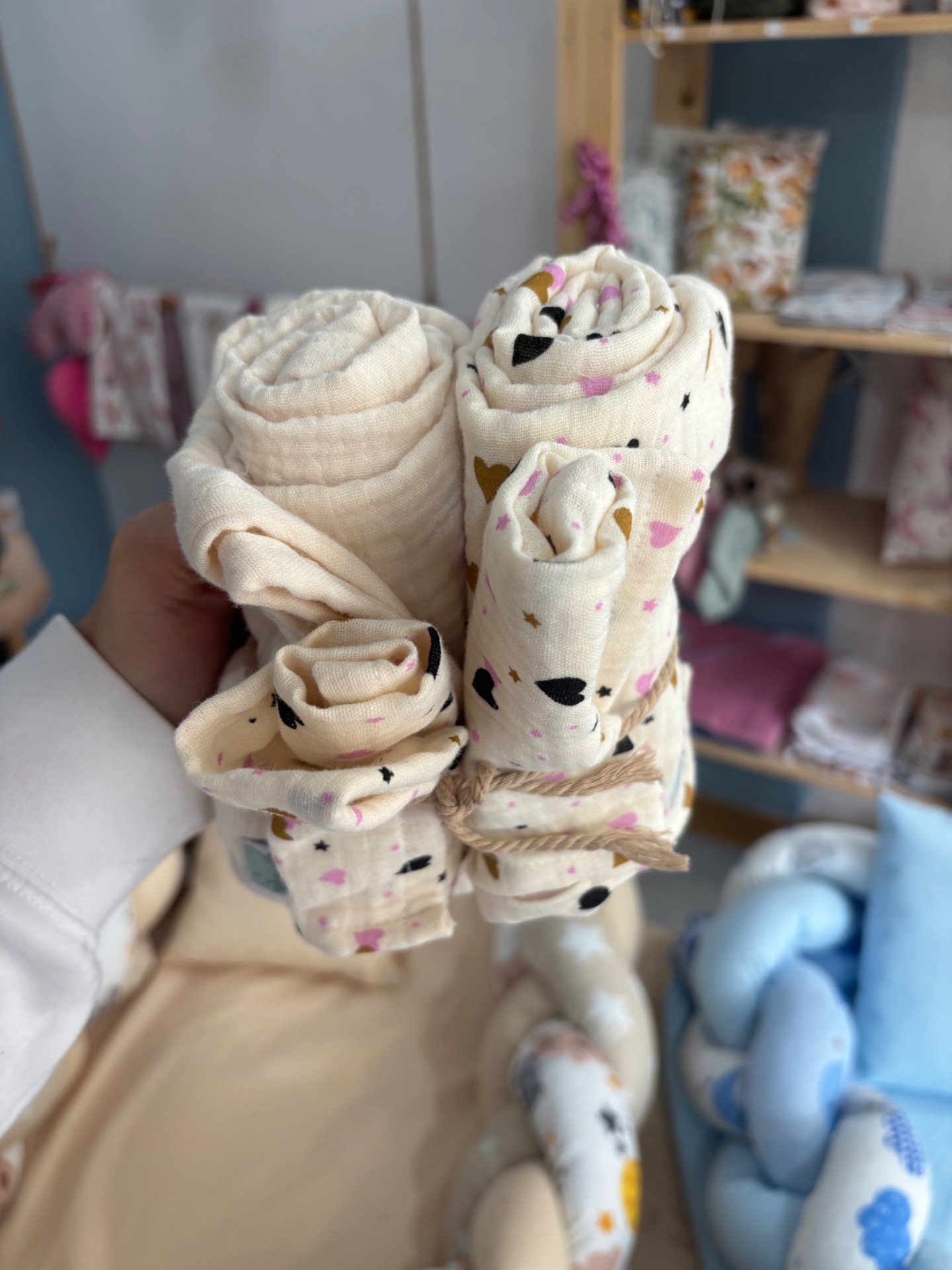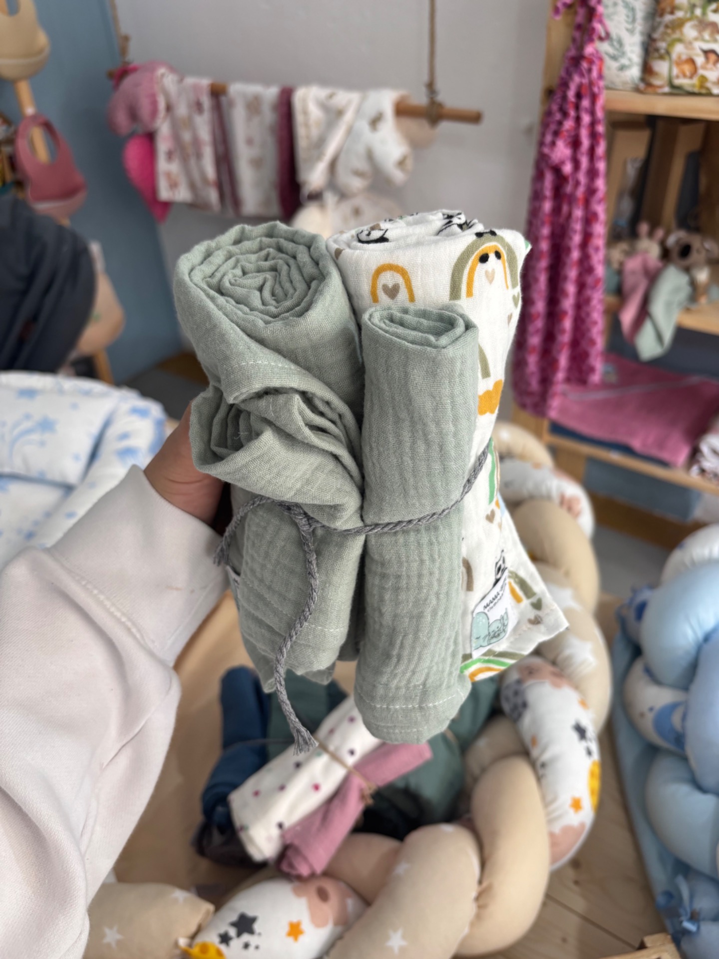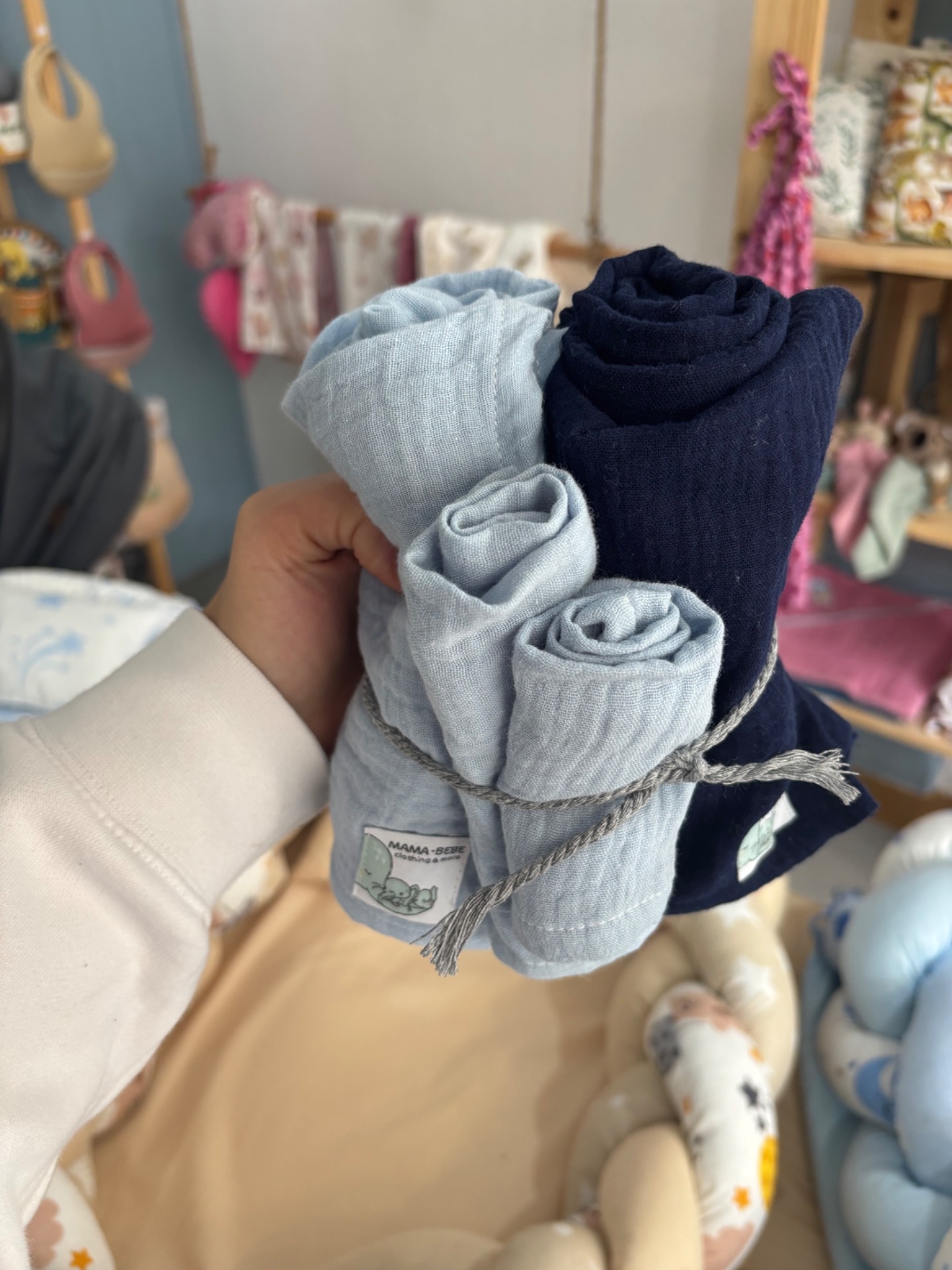 Σετ πάνας αγκαλιάς κατασκευασμένο από μουσελίνα, ένα φυσικό, εξαιρετικά μαλακό και αναπνεύσιμο ύφασμα, ιδανικό για τη φροντίδα του μωρού από τις πρώτες ημέρες ζωής. Οι πάνες χρησιμοποιούνται για να τυλίγεται το βρέφος, ώστε να μην έρχεται σε επαφή με ρούχα ή επιφάνειες, προσφέροντας αίσθηση καθαριότητας και άνεσης.