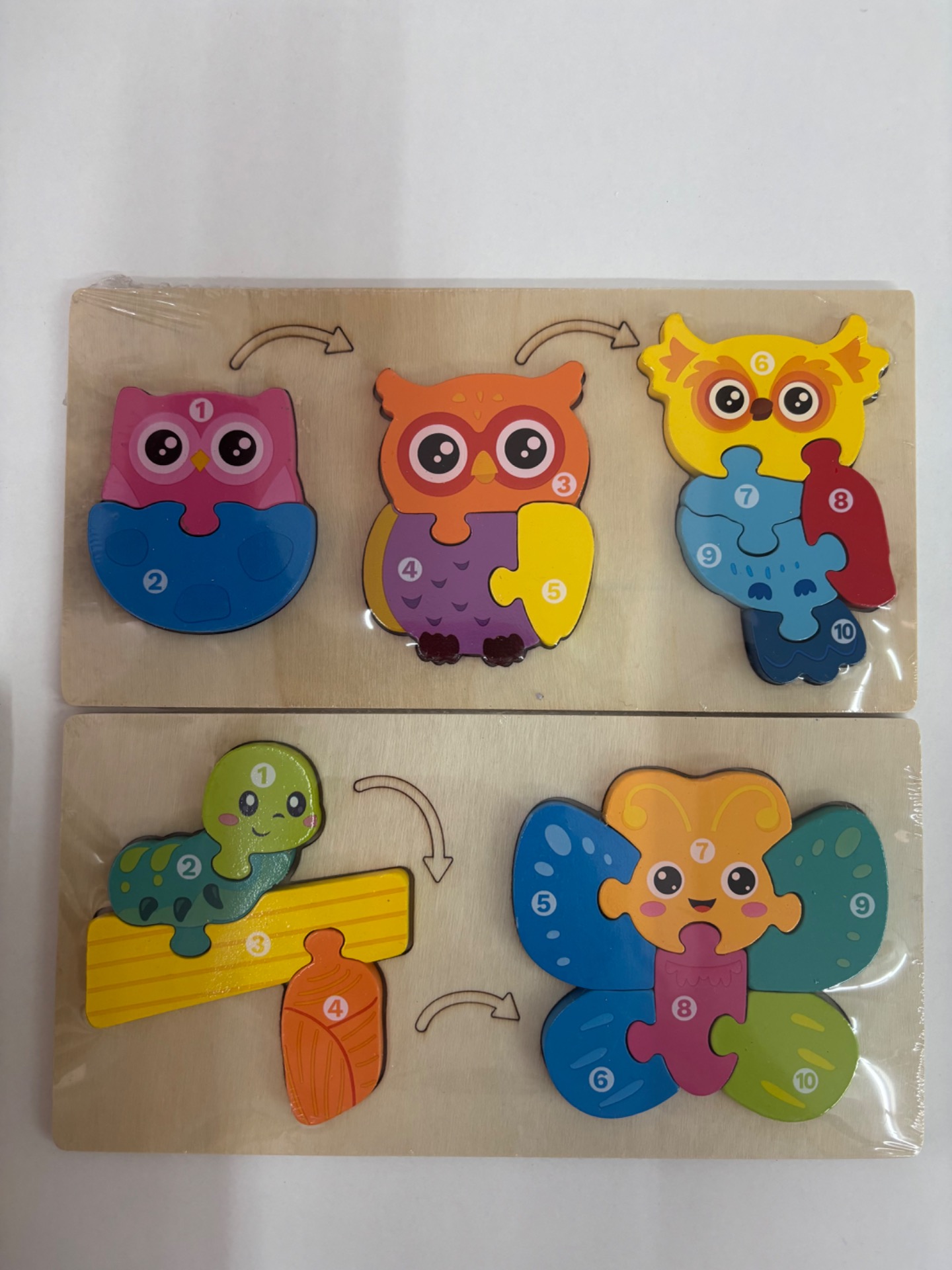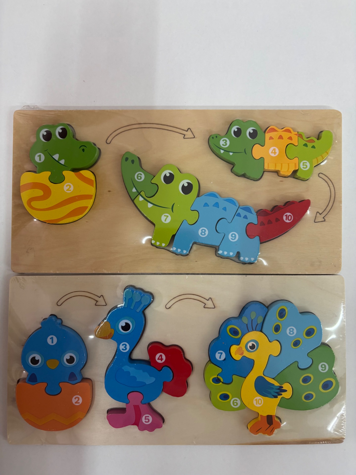 Ξύλινο εκπαιδευτικό παζλ που παρουσιάζει με απλό και κατανοητό τρόπο τον κύκλο ζωής ζώων. Μέσα από τη συναρμολόγηση των αριθμημένων κομματιών, το παιδί μαθαίνει τη σωστή ακολουθία των σταδίων ανάπτυξης, ενισχύοντας τη λογική σκέψη και την παρατηρητικότητα.